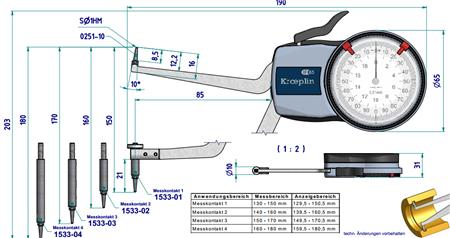 德国kroeplin针盘式内卡规H2M130,测量范围:130-180mm,精度0.01mm,喉深长度:85mm。