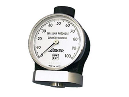ASKER橡胶硬度计FP型, 是一种具有大压头和加压表面的硬度计,与 Asker F 型类似,用于测量特别柔软的样品的硬度。如化妆棉、化妆粉扑硬度测量,压面形状设计为椭圆形。近年来,也被用于凝胶状物质和软胶辊硬度测量。