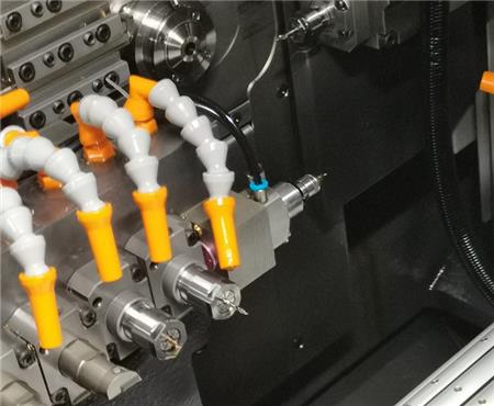 津上S205A侧面加装高频铣,可实现高精密高速加工。转速有8万转和6万转可选。只需要设计一个治具固定在走心机侧面刀座上都可以了。