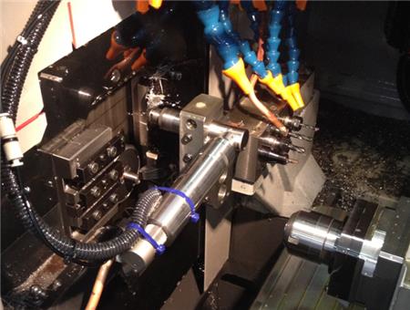 津上走心机BO124加装侧铣动力头RAS-151E,内置减速器,出力大,可实现侧面铣削加工,如侧面钻孔、侧面铣削、侧面倒角等加工。