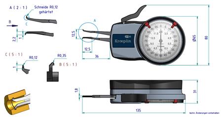 kroeplin带表内卡规H102,测量范围2.5 - 12.5 mm,精度:0.005 mm。