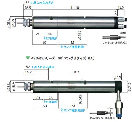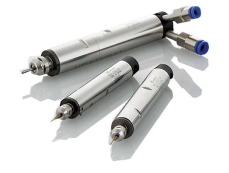主轴跳动精度2um以内。 外径材质为高硬度热处理,形状有直线型和90°2种。(R-直线型,RA-90°型) 消音装置采用排气式消音器,1m的距离我们测试结果为70db。