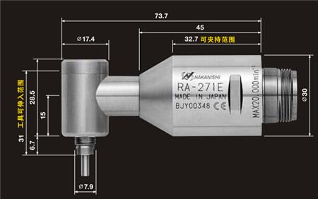 日本NAKANISHI直角高速电主轴RA-271E,转速:13300转/min,跳动精度2μm以内,重量385g,这款主轴可用于钻孔、铣削、切割、去毛刺等领域。