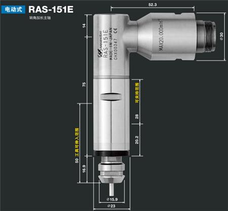 日本NAKANISHI直角高速电主轴RAS-151E,搭配电马达EM-3060/EM-3030T配套使用,可加装多种小型精密数控车床,如各品牌走心机、排刀机等进行侧铣、端面铣削、钻孔等加工使用。